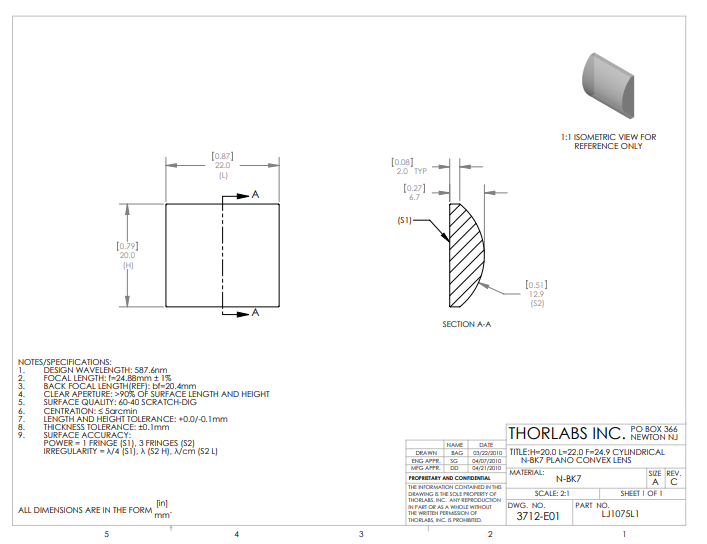 Thorlabs索雷博     LJ1075L1   平凸柱面透镜