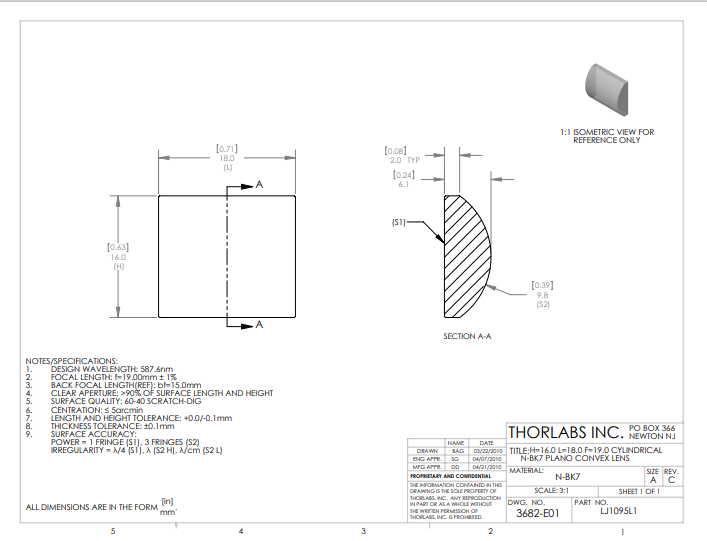 Thorlabs索雷博 LJ1095L1 平凸柱面透镜