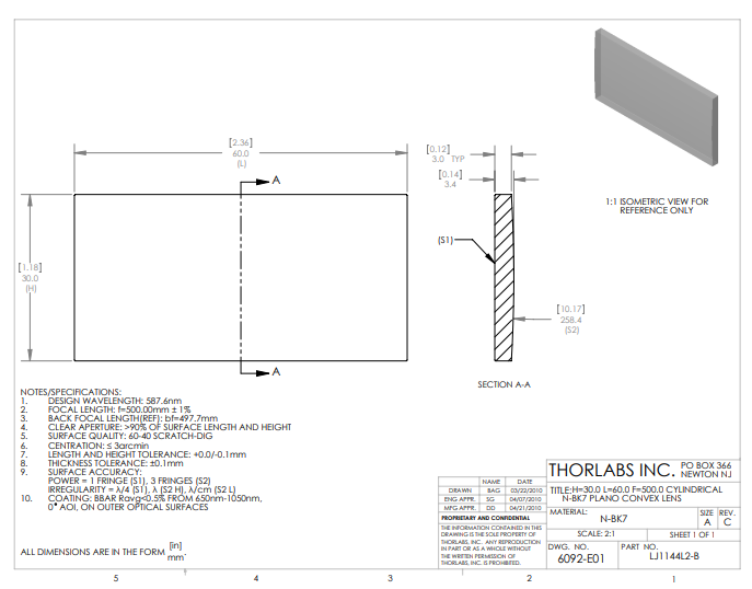 Thorlabs索雷博 LJ1144L2-B 平凸柱面透镜