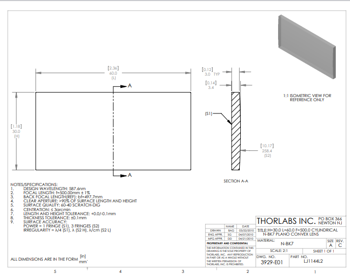 Thorlabs索雷博     LJ1144L2 平凸柱面透镜