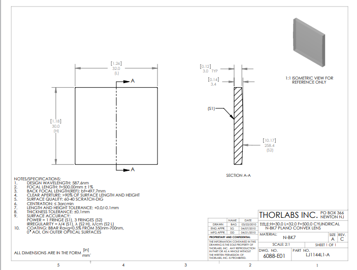 Thorlabs索雷博 LJ1144L1-A 平凸柱面透镜