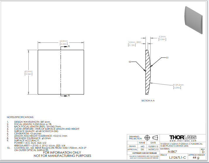 Thorlabs索雷博     LJ1267L1-C   平凸柱面透镜