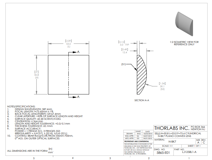 Thorlabs索雷博 LJ1258L1-A 平凸柱面透镜