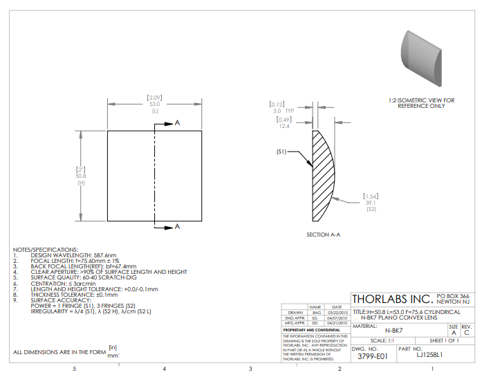 Thorlabs索雷博     LJ1258L1   平凸柱面透镜