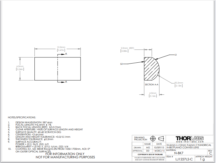 Thorlabs索雷博     LJ1227L2-C   平凸柱面透镜