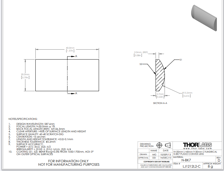 Thorlabs索雷博 LJ1212L2-C 平凸柱面透镜