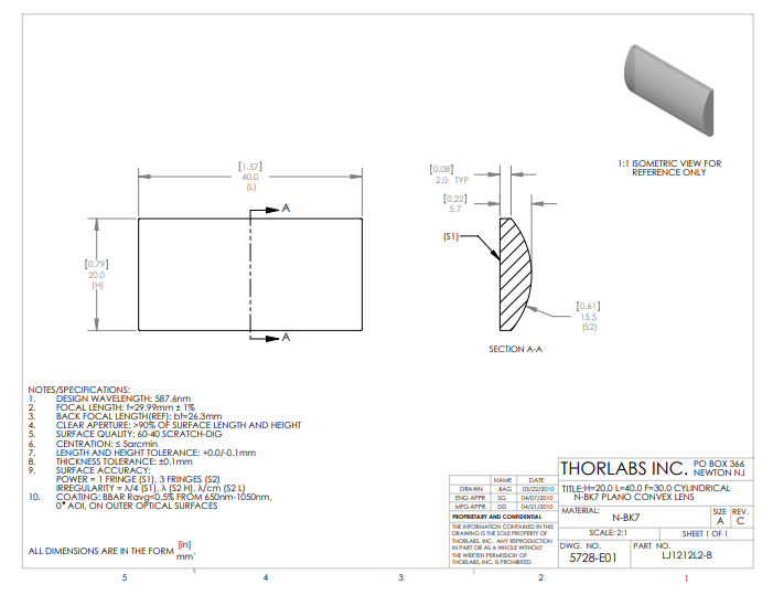 Thorlabs索雷博 LJ1212L2-B 平凸柱面透镜