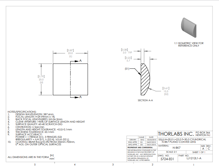 Thorlabs索雷博     LJ1212L1-A   平凸柱面透镜