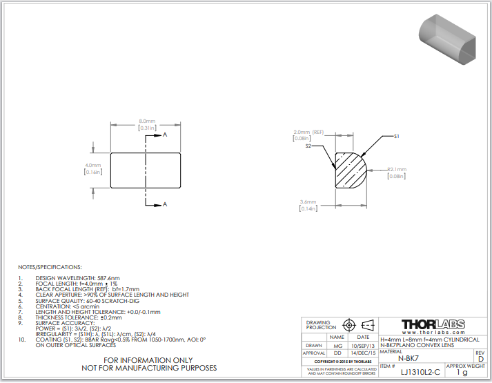 Thorlabs索雷博     LJ1310L2-C   平凸柱面透镜