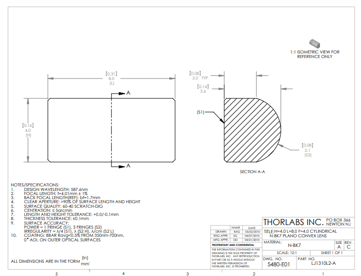 Thorlabs索雷博 LJ1310L2-A 平凸柱面透镜