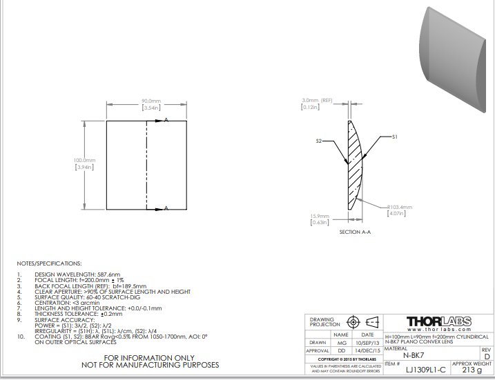 Thorlabs索雷博     LJ1309L1-C   平凸柱面透镜