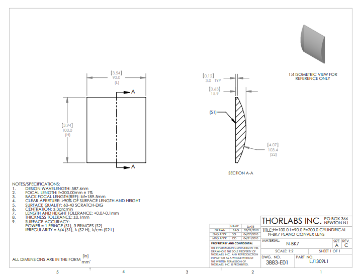 Thorlabs索雷博 LJ1309L1 平凸柱面透镜