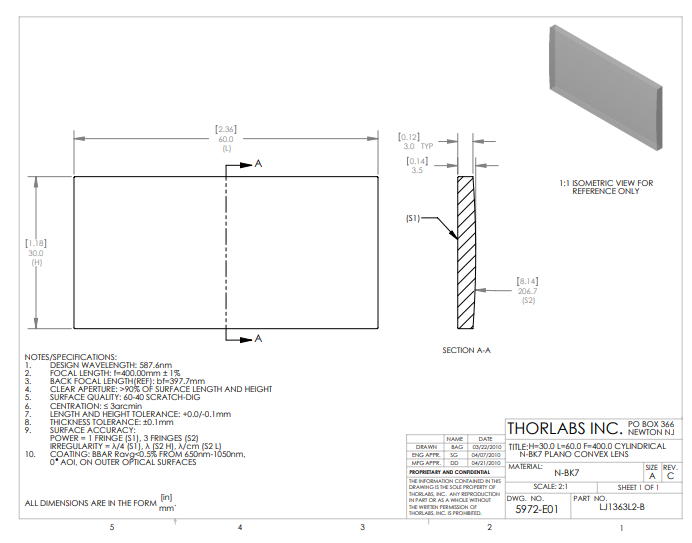 Thorlabs索雷博 LJ1363L2-B 平凸柱面透镜