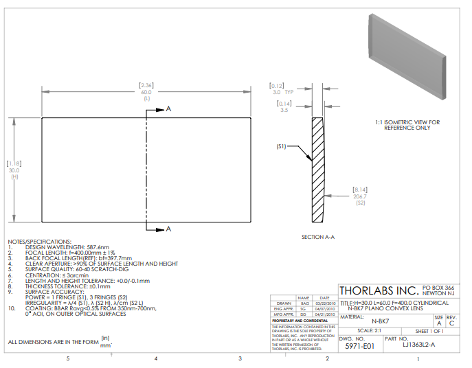 Thorlabs索雷博 LJ1363L2-A 平凸柱面透镜