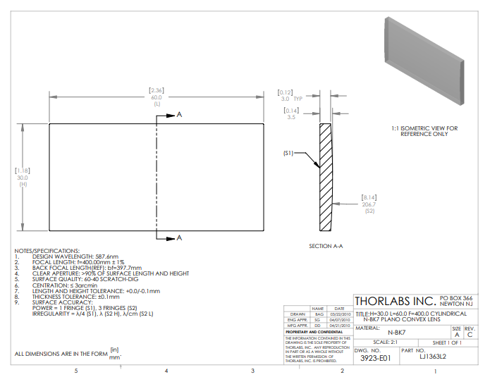 Thorlabs索雷博     LJ1363L2   平凸柱面透镜
