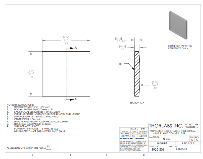 Thorlabs索雷博     LJ1363L1   平凸柱面透镜