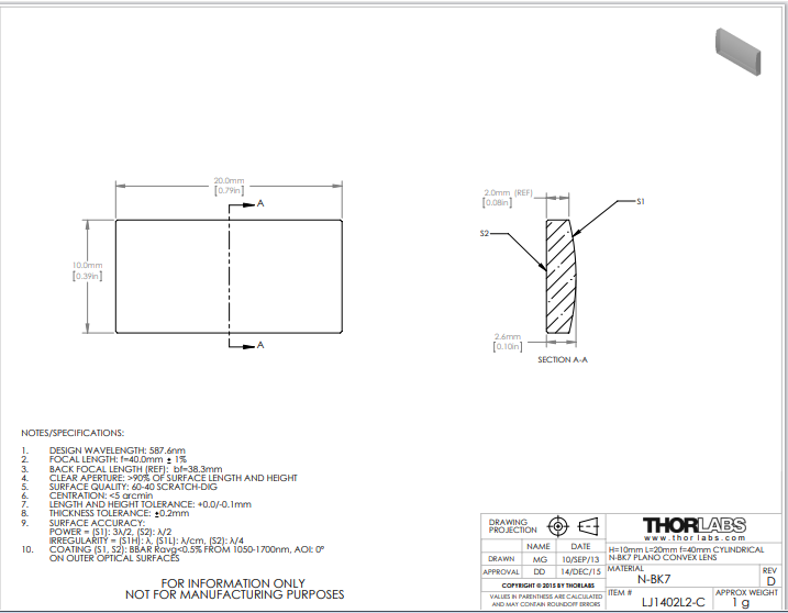Thorlabs索雷博 LJ1402L2-C 平凸柱面透镜