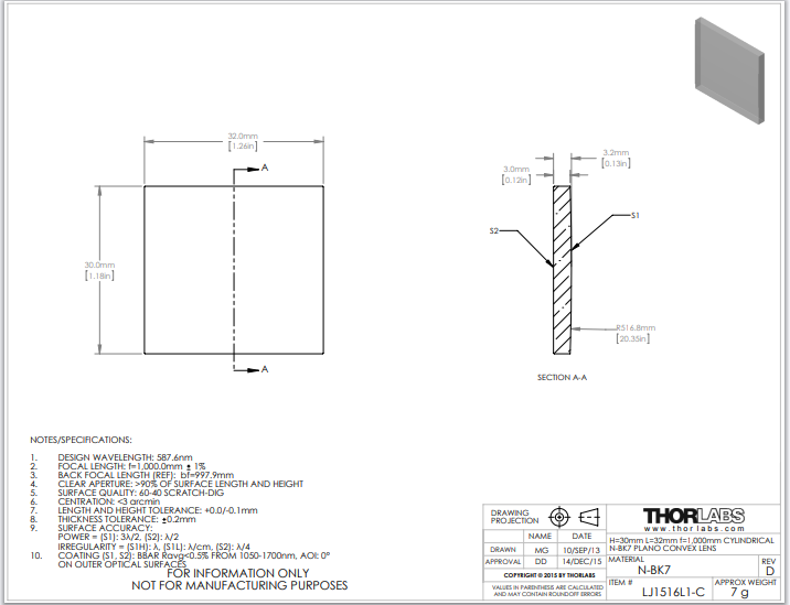 Thorlabs索雷博 LJ1516L1-C 平凸柱面透镜