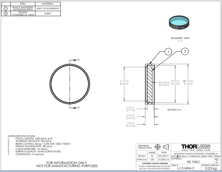 Thorlabs索雷博     LJ1516RM-C   平凸圆形柱面透镜