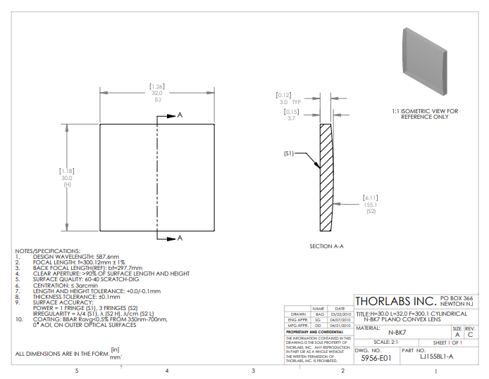Thorlabs索雷博 LJ1558L1-A 平凸柱面透镜
