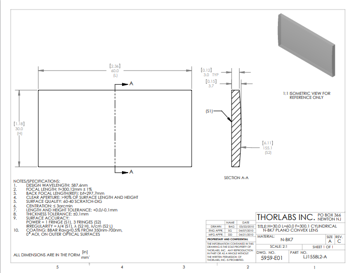Thorlabs索雷博 LJ1558L2-A 平凸柱面透镜
