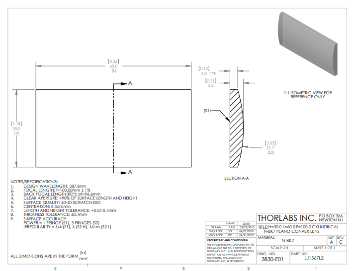 Thorlabs索雷博 LJ1567L2 平凸柱面透镜