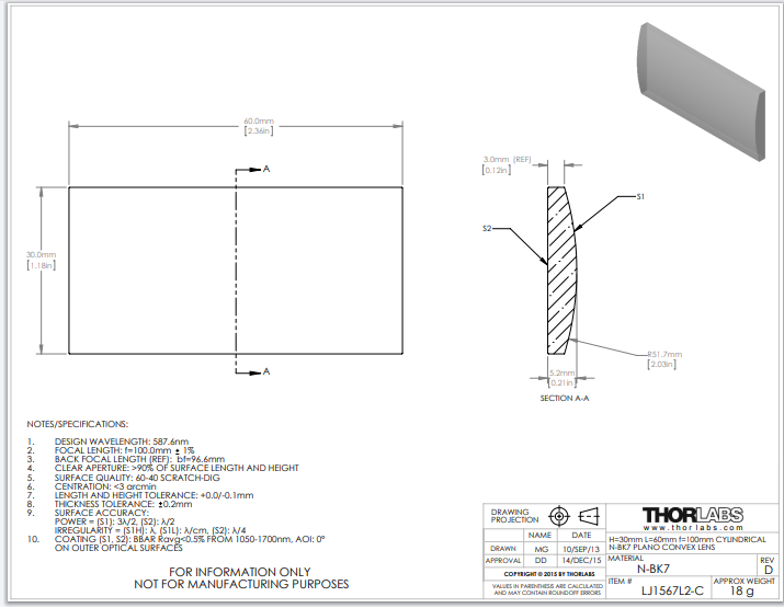 Thorlabs索雷博 LJ1567L2-C 平凸柱面透镜
