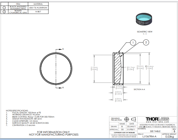 Thorlabs索雷博 LJ1567RM-A 平凸圆形柱面透镜