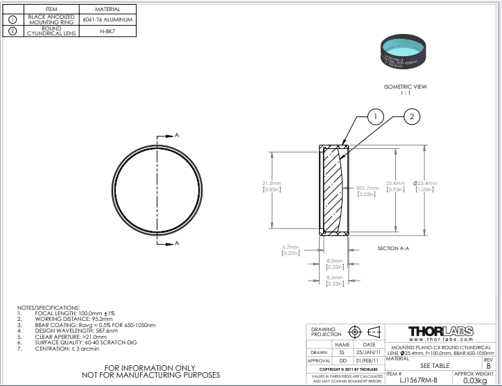 Thorlabs索雷博 LJ1567RM-B 平凸圆形柱面透镜