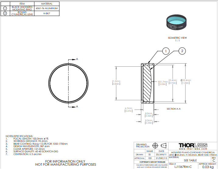 Thorlabs索雷博     LJ1567RM-C   平凸圆形柱面透镜