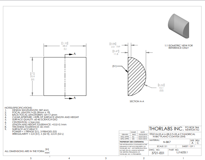 Thorlabs索雷博 LJ1622L1 平凸柱面透镜