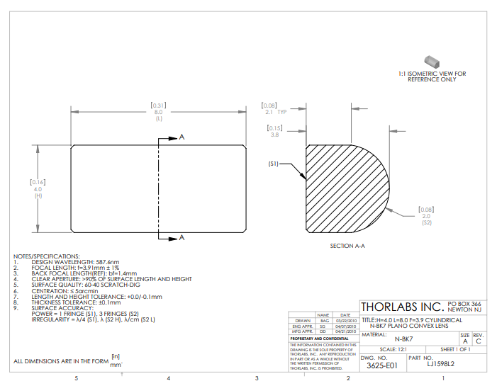 Thorlabs索雷博 LJ1598L2 平凸柱面透镜