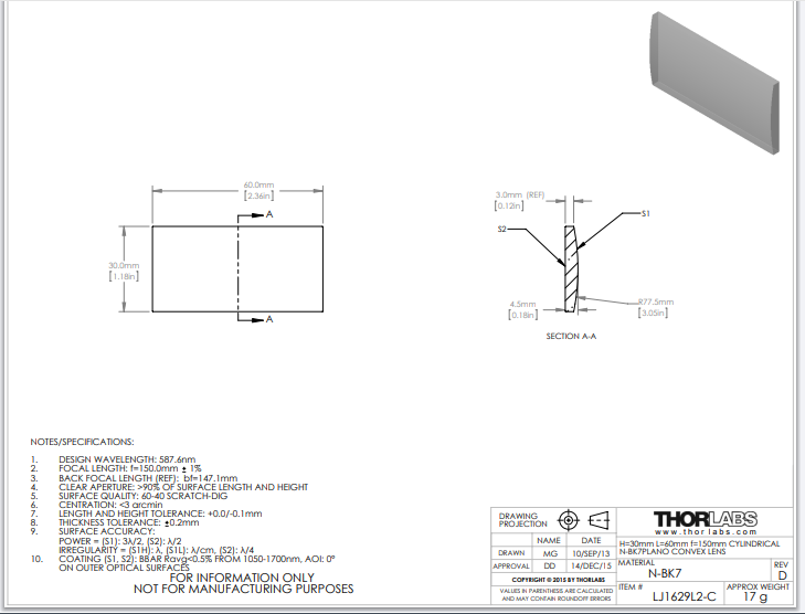 Thorlabs索雷博 LJ1629L2-C 平凸柱面透镜