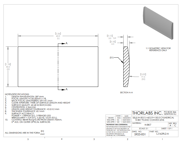Thorlabs索雷博     LJ1629L2-A   平凸柱面透镜