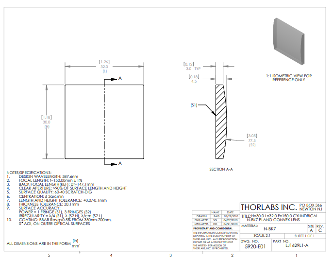 Thorlabs索雷博     LJ1629L1-A   平凸柱面透镜