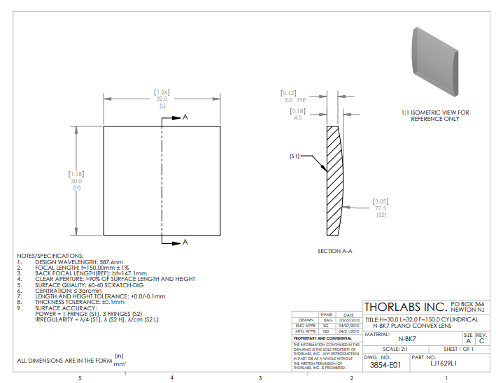 Thorlabs索雷博 LJ1629L1 平凸柱面透镜