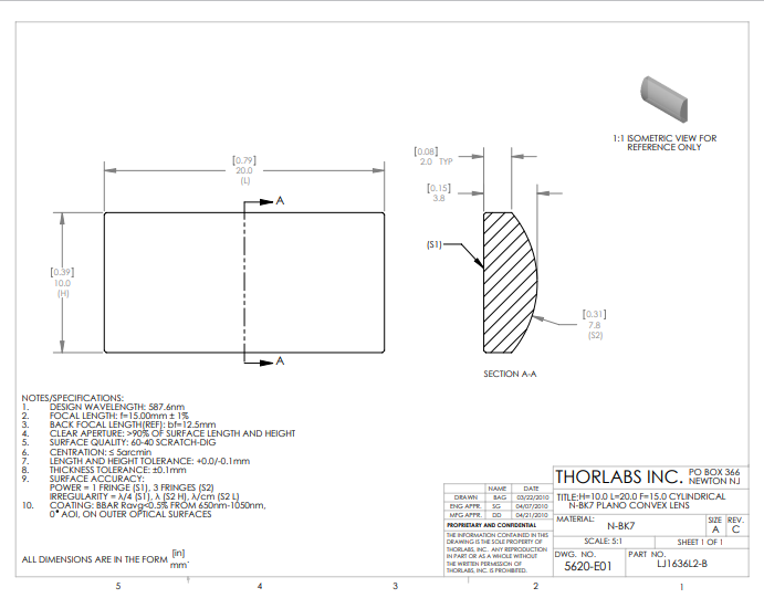 Thorlabs索雷博 LJ1636L2-B 平凸柱面透镜