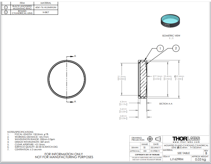 Thorlabs索雷博     LJ1629RM   平凸圆形柱面透镜