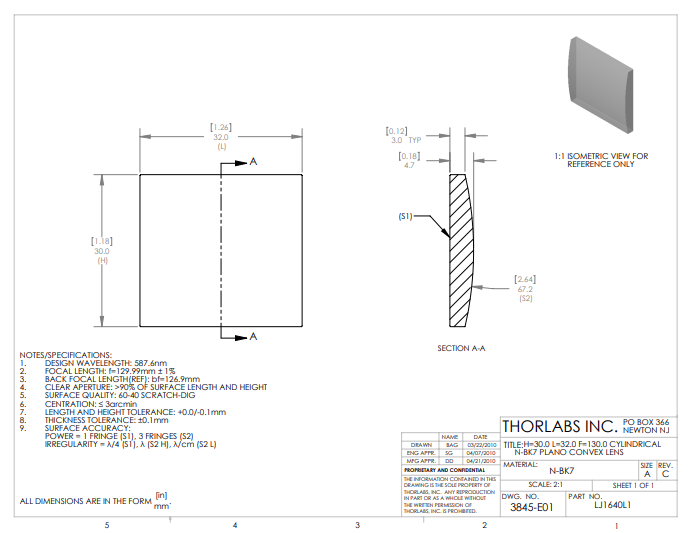 Thorlabs索雷博 LJ1640L1 平凸柱面透镜
