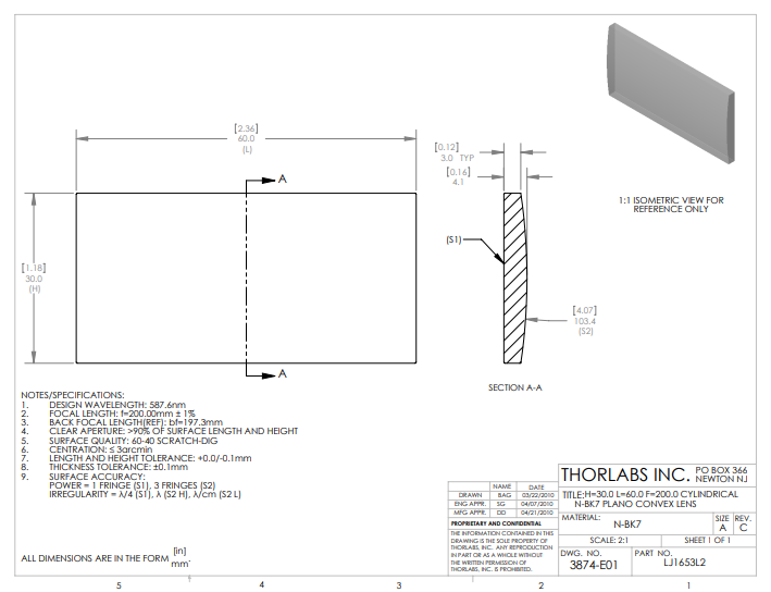 Thorlabs索雷博     LJ1653L2   平凸柱面透镜