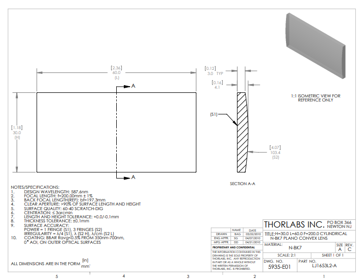 Thorlabs索雷博     LJ1653L2-A   平凸柱面透镜