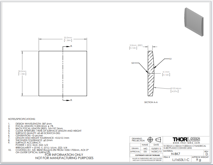 Thorlabs索雷博 LJ1653L1-C 平凸柱面透镜