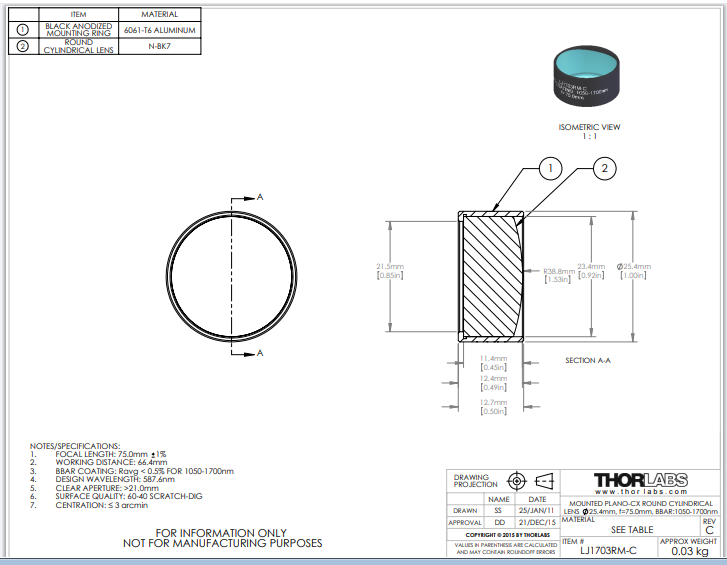 Thorlabs索雷博     LJ1703RM-C   平凸圆形柱面透镜