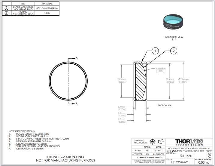 Thorlabs索雷博 LJ1695RM-C 平凸圆形柱面透镜