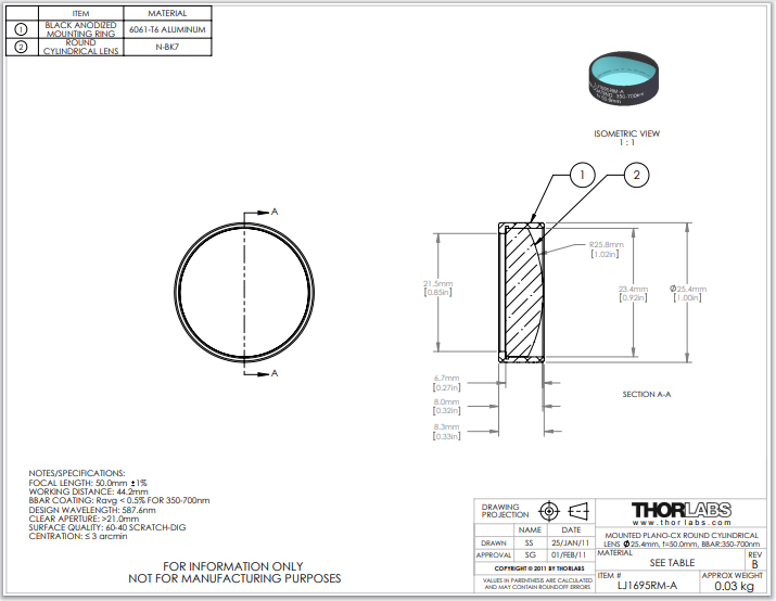 Thorlabs索雷博 LJ1695RM-A 平凸圆形柱面透镜