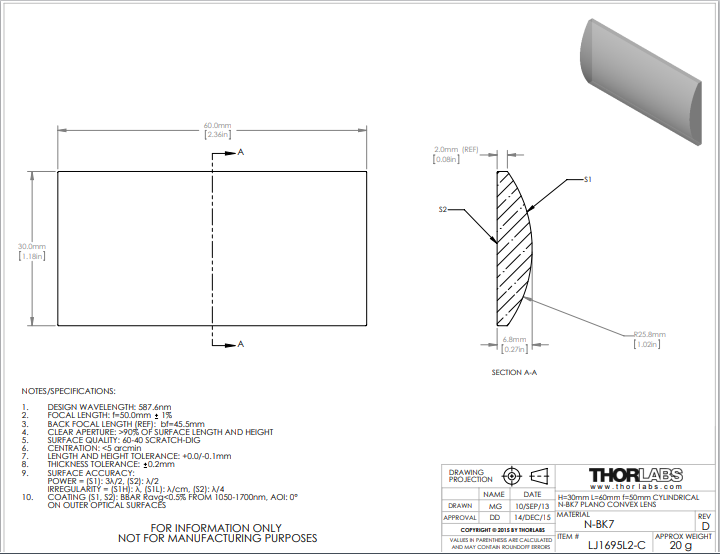 Thorlabs索雷博 LJ1695L2-C 平凸柱面透镜