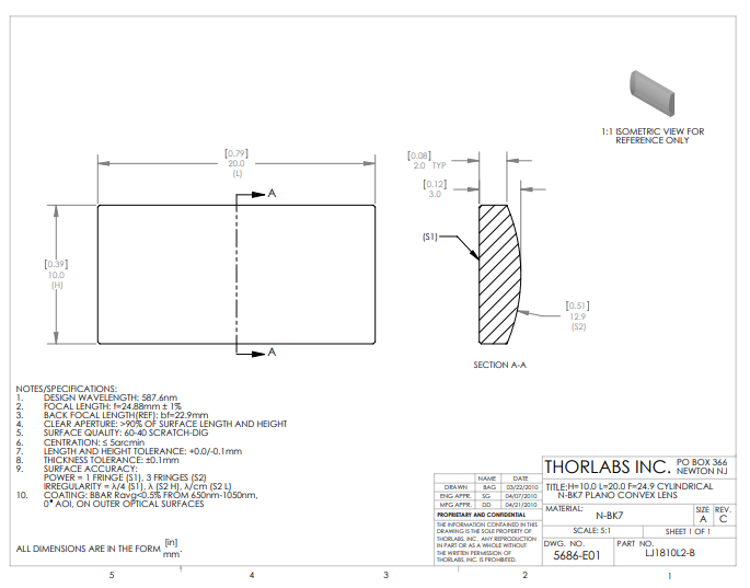 Thorlabs索雷博 LJ1810L2-B 平凸柱面透镜