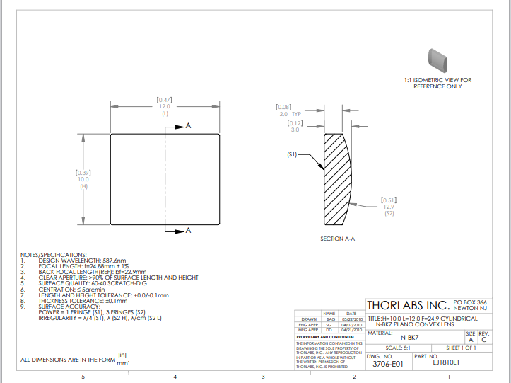 Thorlabs索雷博 LJ1810L1 平凸柱面透镜