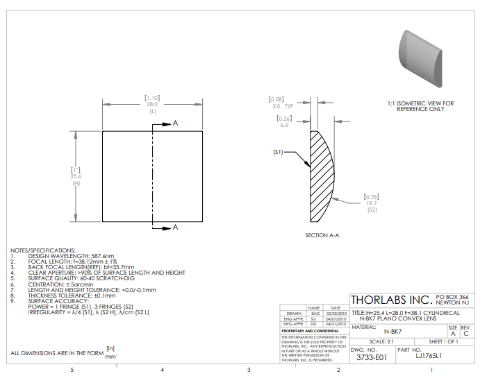 Thorlabs索雷博 LJ1765L1 平凸柱面透镜