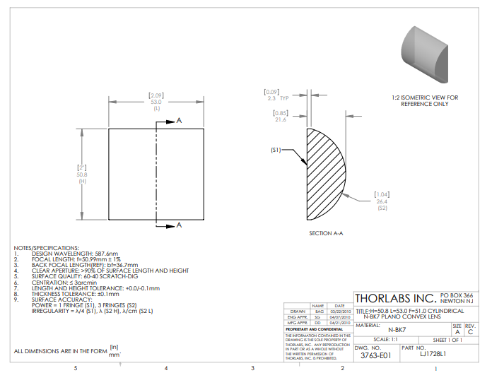 Thorlabs索雷博 LJ1728L1 平凸柱面透镜